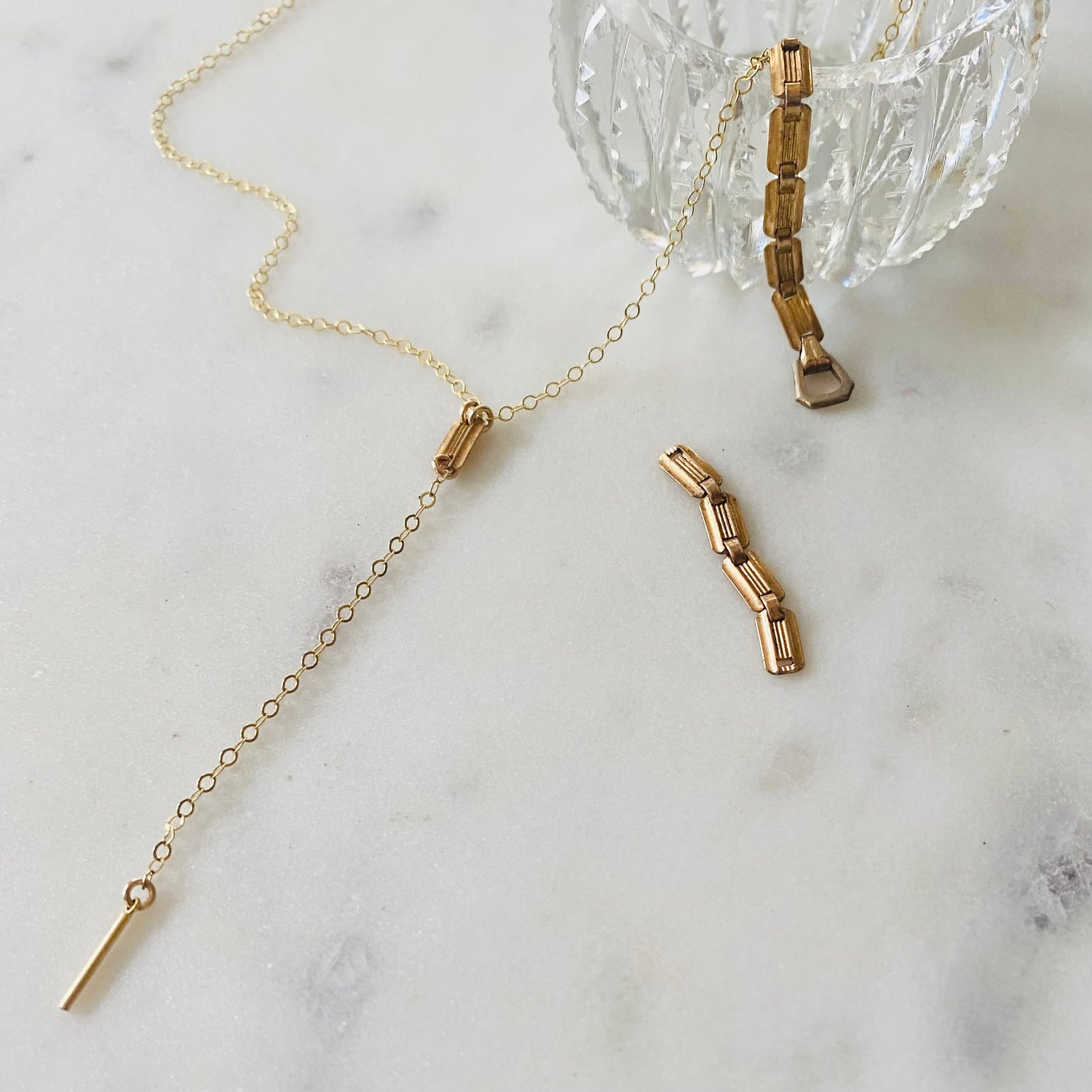 Unique+Unexpected. Limited Edition. This pretty delicate new design is handcrafted using gold filled components and a single link from a mid century watch band. Measures 16-17” with a 1” adjuster.